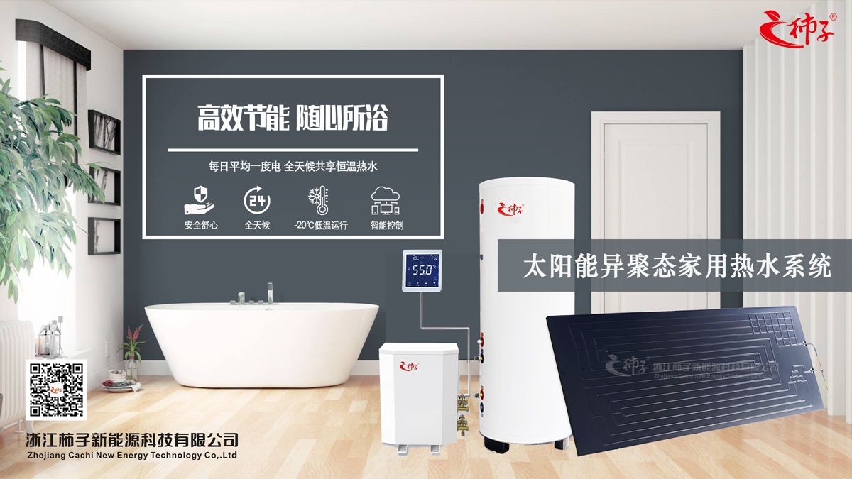 柿子新能源自主研發(fā)的“太陽能異聚態(tài)家用熱水系統(tǒng)”根據(jù)逆卡諾循環(huán)原理,采用電能驅(qū)動,通過傳熱工質(zhì)將聚熱板吸收的太陽能及自然界中其他能源(如風(fēng)能、雨水能)釋放到使用末端,從而滿足人們對熱水的需求。
