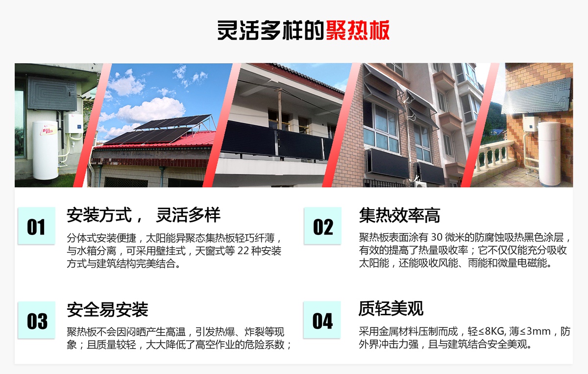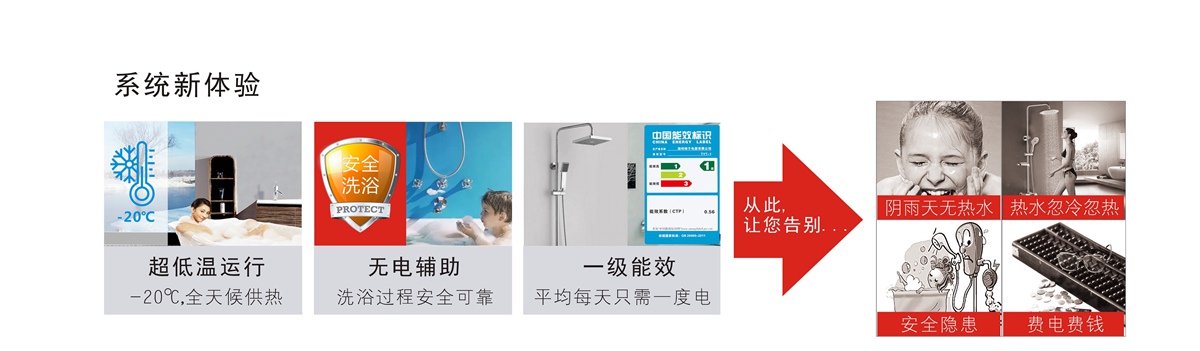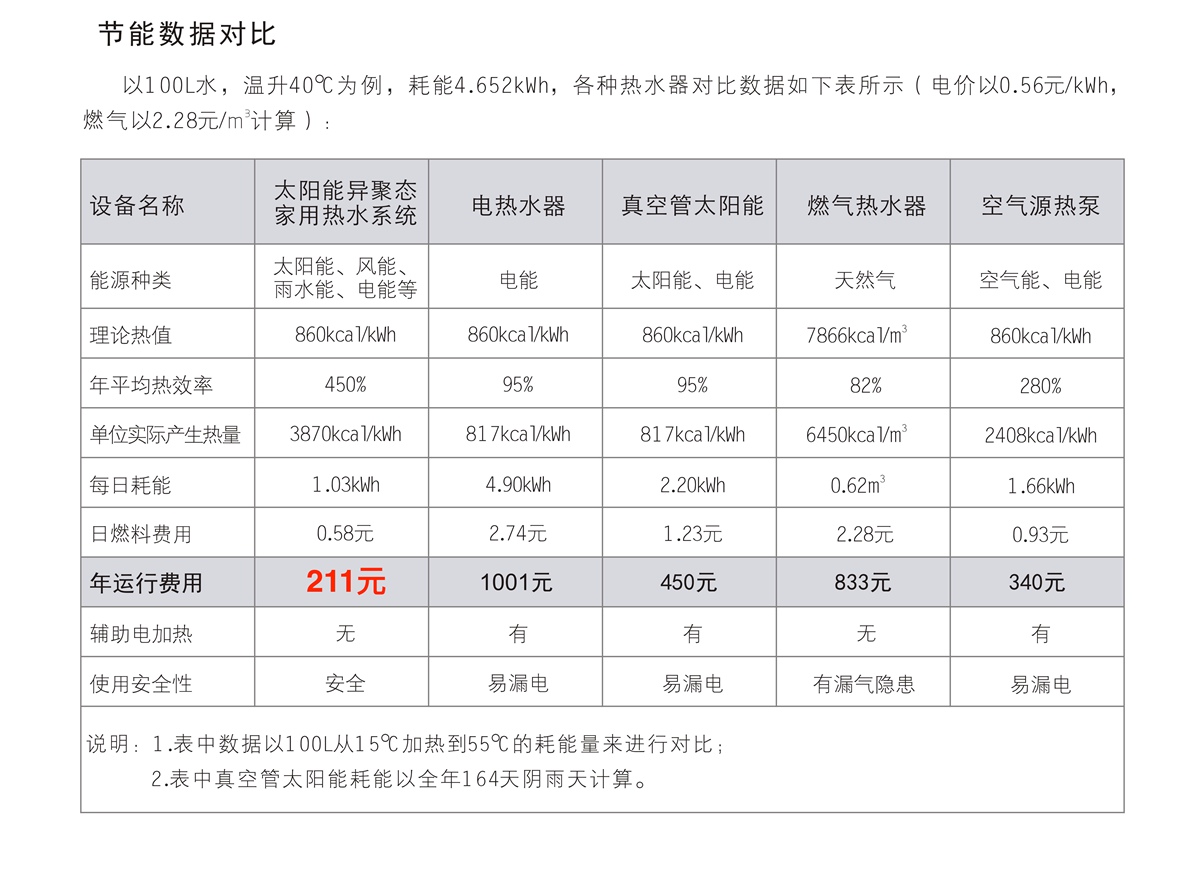 在不同的運行工況下,“太陽能異聚態(tài)家用熱水系統(tǒng)”每消耗1度電就能從低溫?zé)嵩粗形?-7度電的熱量,節(jié)能效果非常顯著?!疤柲墚惥蹜B(tài)熱利用系統(tǒng)”相比單純的太陽能系統(tǒng),制熱效率更高,適應(yīng)能力更強。該產(chǎn)品有太陽時效率比普通太陽能產(chǎn)品高;在陰雨天、夜晚,可利用自然界中的其他能源提供熱能,克服了單純太陽能產(chǎn)品在沒有太陽的情況下無法供熱的缺陷和弊端。